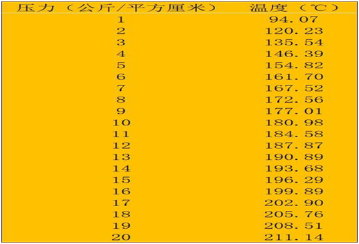 按1MPa=1000kPa=10.2kgf/cm2(公斤/平方厘米),對(duì)照飽和蒸汽壓力(MPa表示)與蒸汽溫度的標(biāo)準(zhǔn)表,可以計(jì)算得到飽和蒸汽壓力(kgf/cm2表示)與蒸汽溫度之間的關(guān)系,如下所示: